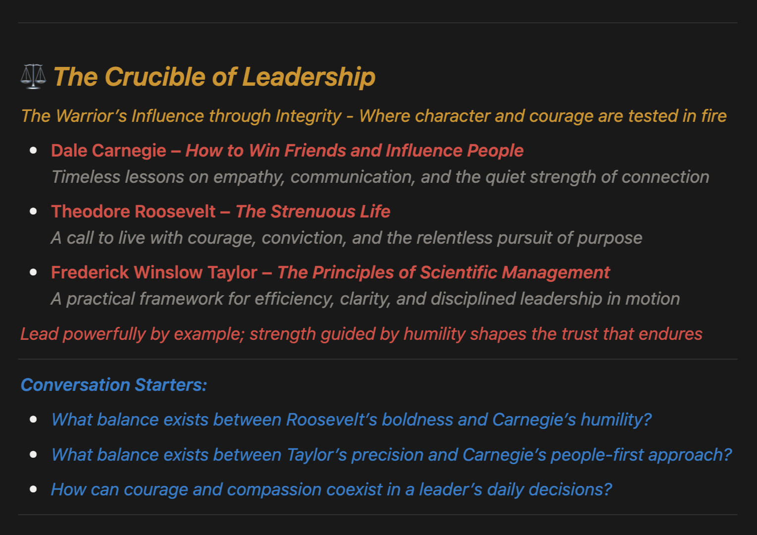 Mind, Creation, Leadership, & Legacy.